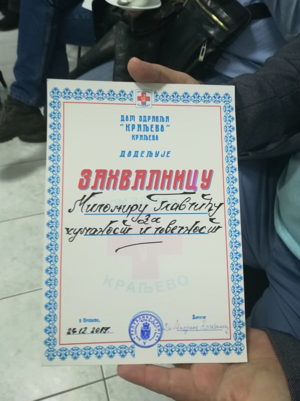 Овај скуп био је прилика да Дом здравља уручи Миломиру Главчићу захвалницу за хуманост и човечност, коју је у његово име примио блиски рођак, Горан Главчић.